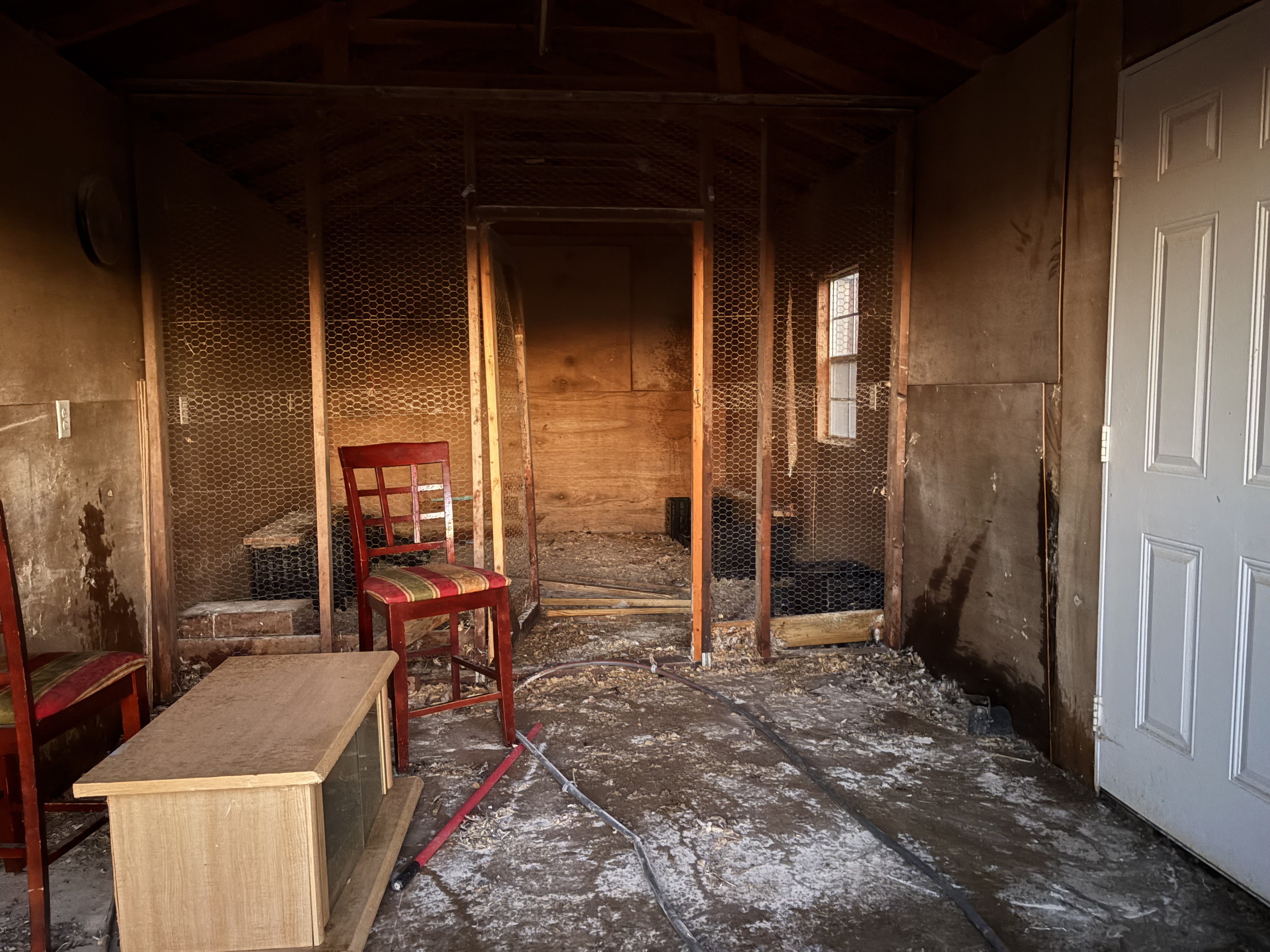 Appears to have been used as a chicken coop. Has insulated walls and electrical wiring.